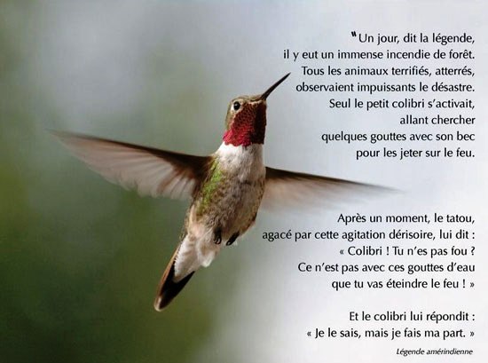 Selon la lgende amrindienne, le Colibri "fait sa part" en puisant de l'eau avec son tout petit bec pour teindre tout l'incendie de la fort. Il fait face l'incomprhension des autres animaux de la fort, qui trs vite se joignent au petit oiseau pour "faire aussi leur part"